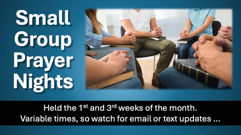 Prayer night is held during 1st and 3rd weeks of each month. The specific location for each session will be sent out beforehand, either via our weekly, emailed newsletter and/or a short text message.